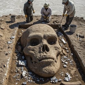 BREAKING DISCOVERY: Giant Skull Unearthed in Remote Desert Shocks the World! Mystery NgoPhong October 19, 2025 In an arid, wind-scorched expanse of salt flats, a team of archaeologists has unearthed what could become one of the most unsettling discoveries of the century — an enormous humanoid skull, measuring nearly twice the size of that of […]