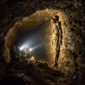 In a discovery that’s both haunting and world-shattering, a team of underground explorers has stumbled upon what appears to be a towering humanoid skeleton—still standing upright—entombed within the wall of a long-sealed cavern. The chamber, located deep beneath an uncharted mountain range, was first entered after a rockslide exposed a narrow passage leading into […]
