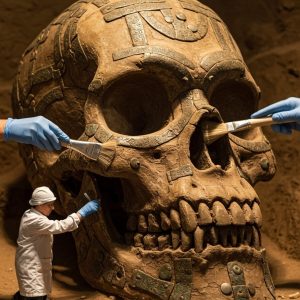 BREAKING DISCOVERY: GIANT SKULL WITH METALLIC IMPLANTS FOUND IN ANCIENT SITE! In a revelation that blurs the boundaries between archaeology, science, and science fiction, researchers at a remote excavation site have uncovered an enormous humanoid skull embedded with metallic plates and intricate carvings, sending shockwaves through the global scientific community. The fossilized cranium — measuring […]