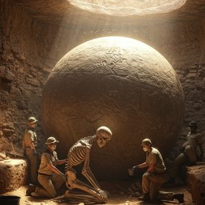 Unearthed in Silence: Colossal Kneeling Skeleton Found Guarding Mysterious Sphere in Hidden Chamber