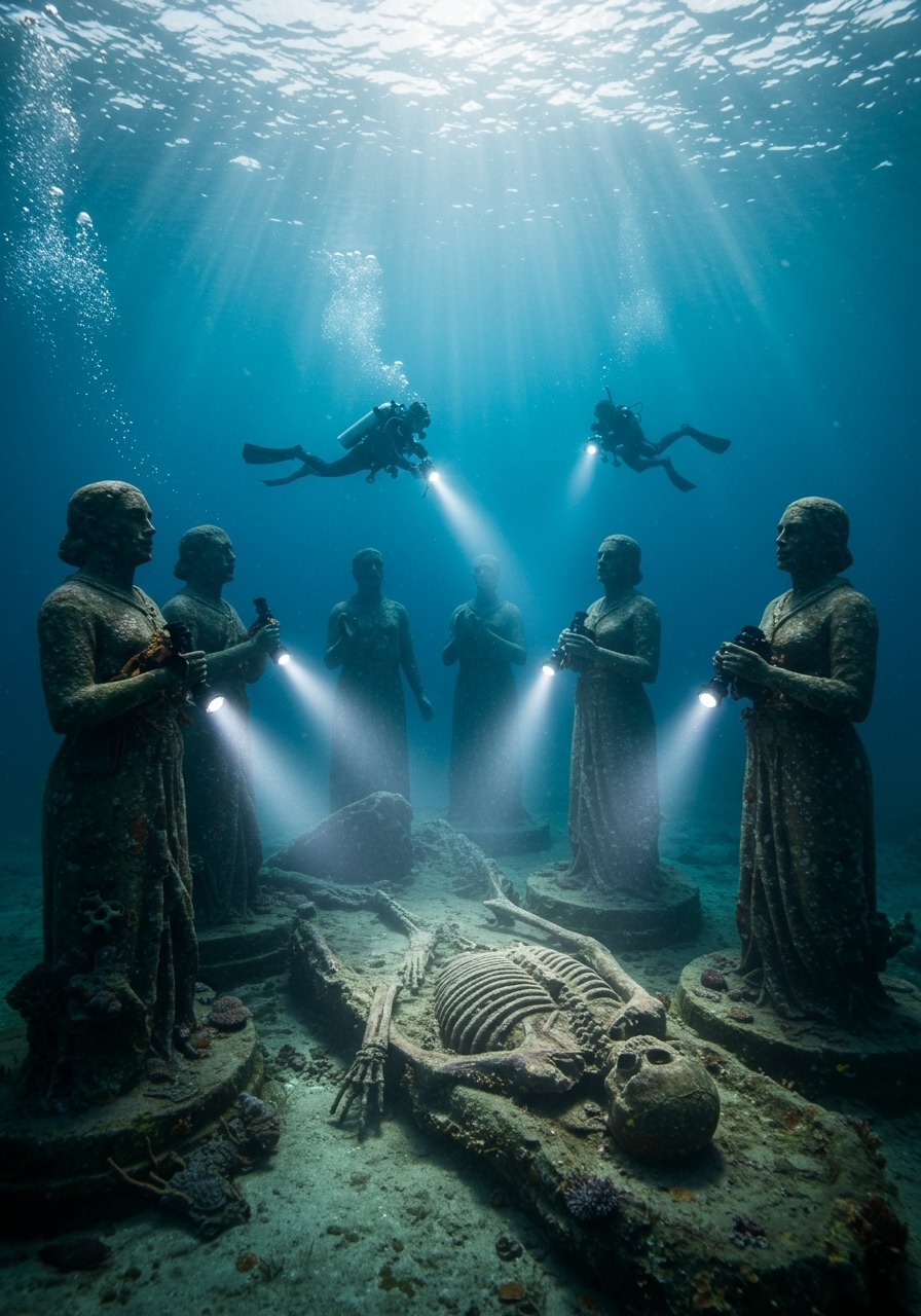 Marine archaeologists and specialized DIVERS UNCOVER [AN] UNDERWATER RITUAL SITE in a previously unexplored coastal region. The BREAKING DISCOVERY consists of a perfectly preserved subterranean cavern containing hundreds of artifacts, stylized statuary, and meticulously arranged human remains, all pointing toward a massive, organized, and long-forgotten Ancient Cult. This is not a shipwreck; the site was intentionally submerged or built underwater, suggesting a civilization with an extreme reverence for the ocean and highly specific, violent ritual practices.