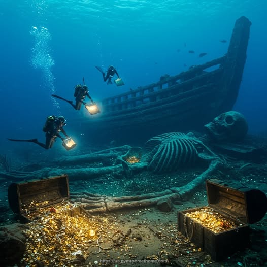 In a stunning revelation beneath the waves, a team of marine archaeologists has uncovered what could be one of the most mysterious underwater discoveries ever recorded — a massive humanoid skeleton resting beside the wreck of a centuries-old pirate ship. The skeleton, measuring over twelve feet in length, was found lying on the ocean floor surrounded by open treasure chests filled with gold coins, jeweled crowns, and ancient weaponry, all remarkably well-preserved despite centuries beneath the sea.