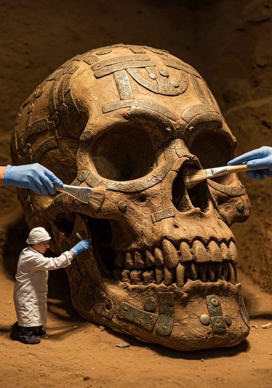 In a revelation that blurs the boundaries between archaeology, science, and science fiction, researchers at a remote excavation site have uncovered an enormous humanoid skull embedded with metallic plates and intricate carvings, sending shockwaves through the global scientific community. The fossilized cranium — measuring nearly twice the size of an adult human’s — features precision-forged metal inlays along the jawline and temple, as well as geometric etchings that appear both decorative and functional. Initial scans reveal that the metallic composition contains alloys unknown to modern metallurgy, with purity levels that far exceed what ancient smelting could have achieved. “This shouldn’t exist,” said one member of the research team before the site was abruptly placed under restricted access. “We’re looking at either an impossibly advanced ancient technology — or evidence of something not entirely human.”