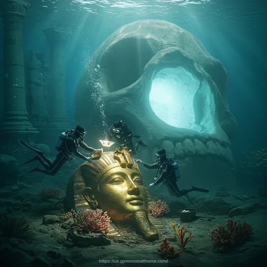 A team of deep-sea explorers has uncovered what may be one of the most astonishing and controversial archaeological discoveries of the century — a colossal golden pharaoh’s head lying in the heart of a submerged ruin. The structure, found more than three kilometers beneath the ocean surface, appears to be part of a sprawling temple complex, complete with massive pillars, stairways, and stone reliefs depicting unknown deities. At the temple’s center rests a golden visage of a ruler whose features bear uncanny similarities to early Egyptian kings, yet the materials and techniques used in its construction are far beyond anything known from that era.