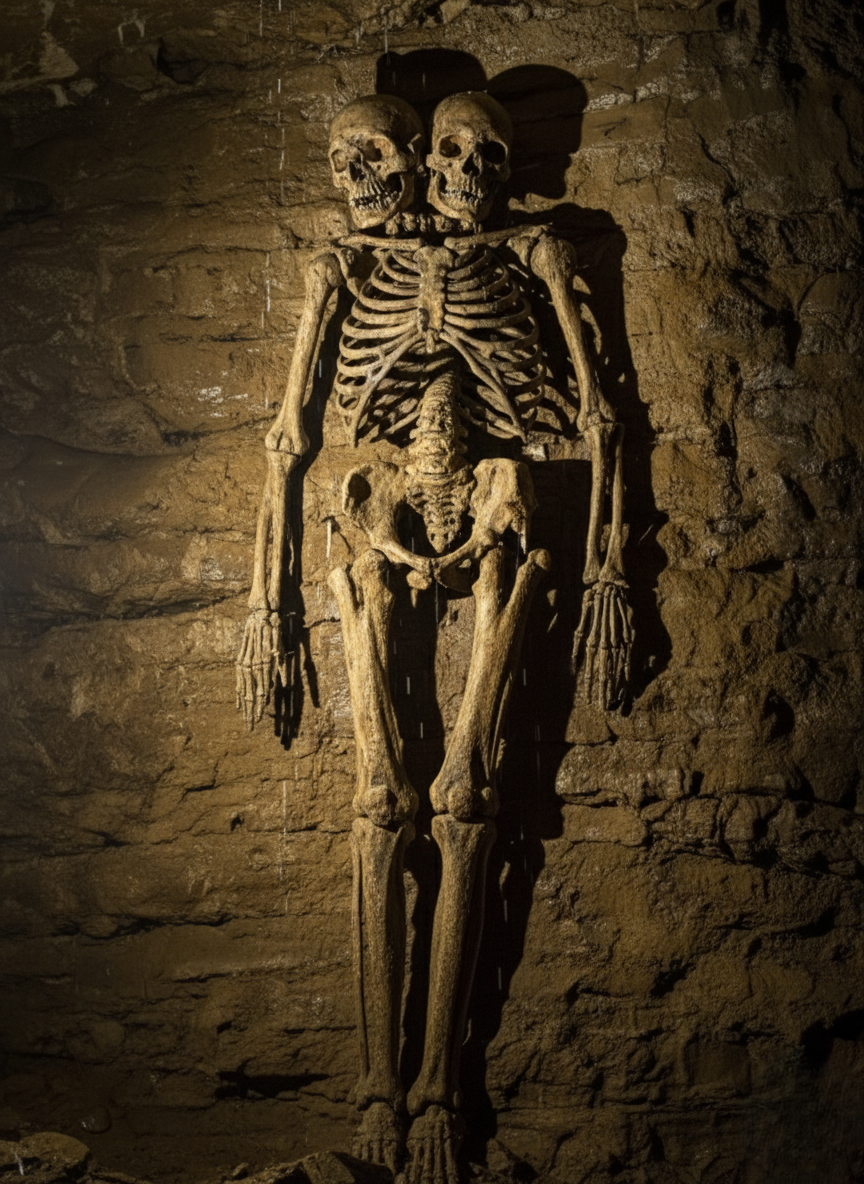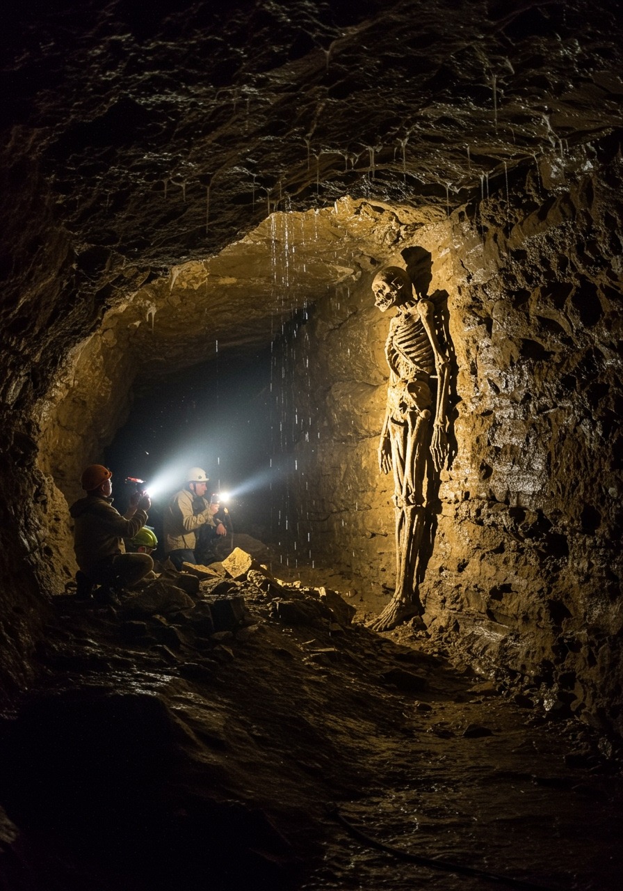 In a discovery that’s both haunting and world-shattering, a team of underground explorers has stumbled upon what appears to be a towering humanoid skeleton—still standing upright—entombed within the wall of a long-sealed cavern. The chamber, located deep beneath an uncharted mountain range, was first entered after a rockslide exposed a narrow passage leading into darkness. What the team found inside defied every scientific expectation: a massive figure, fossilized yet eerily lifelike, its bones fused into the surrounding stone as if the being had been engulfed in a single cataclysmic event. “It’s as though time itself stopped for this creature,” said one member of the expedition. The skeleton’s posture—arms slightly raised, head tilted forward—has led some experts to speculate it wasn’t buried, but petrified mid-motion, frozen at the moment of death.