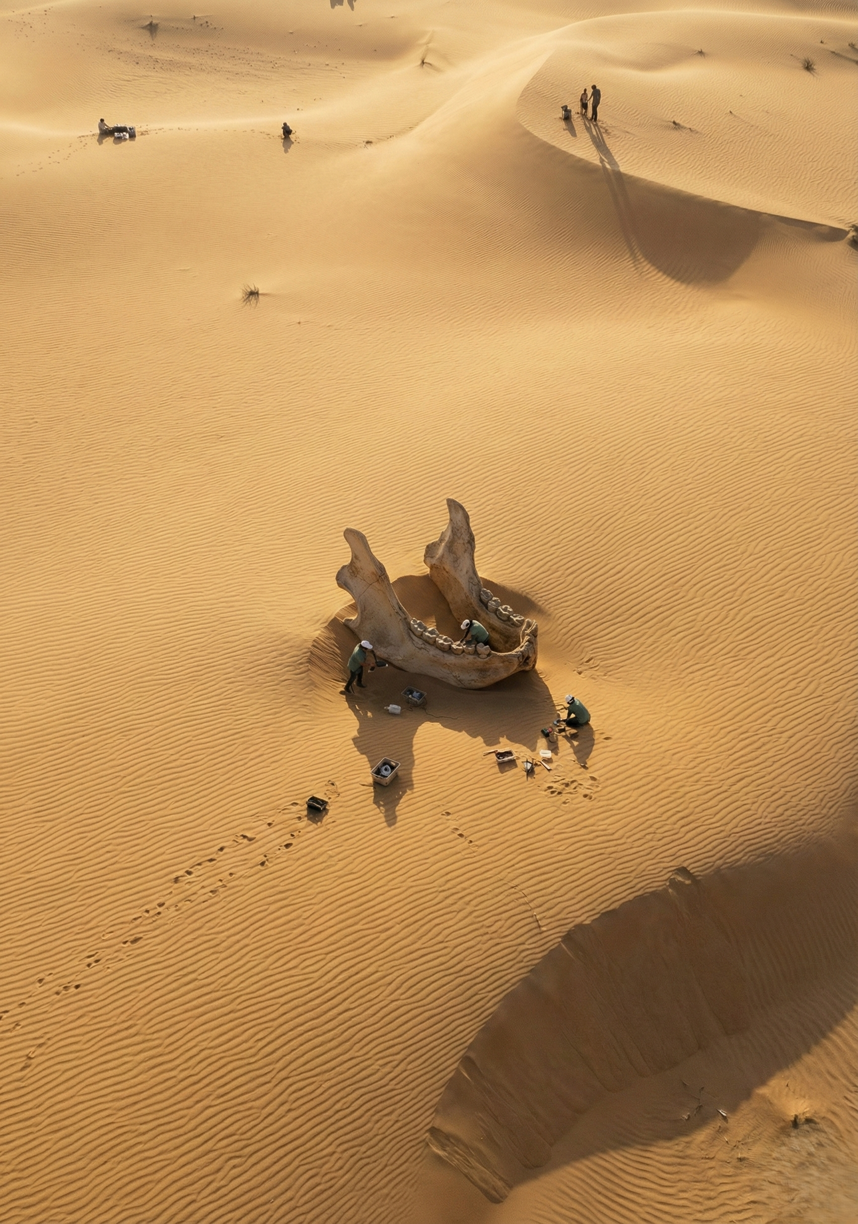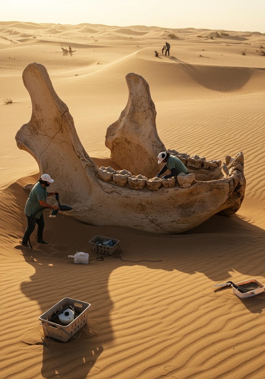 A remote desert expedition has ignited worldwide attention after researchers uncovered a colossal jawbone embedded in a barren stretch of sand, far from any known fossil site. According to initial documentation, the skeletal fragment—several times larger than that of any known human or animal species—was found protruding from a hardened dune field, its massive teeth still intact despite apparent age-related erosion. The discovery stunned the research team, who immediately began securing the area and conducting surface-level measurements. Images released online show scientists visibly startled as they examine the jaw’s immense size, fueling a rapid surge of global curiosity. The vast emptiness of the surrounding landscape only deepens the mystery, prompting urgent questions about what kind of creature could have once inhabited such an unforgiving environment.