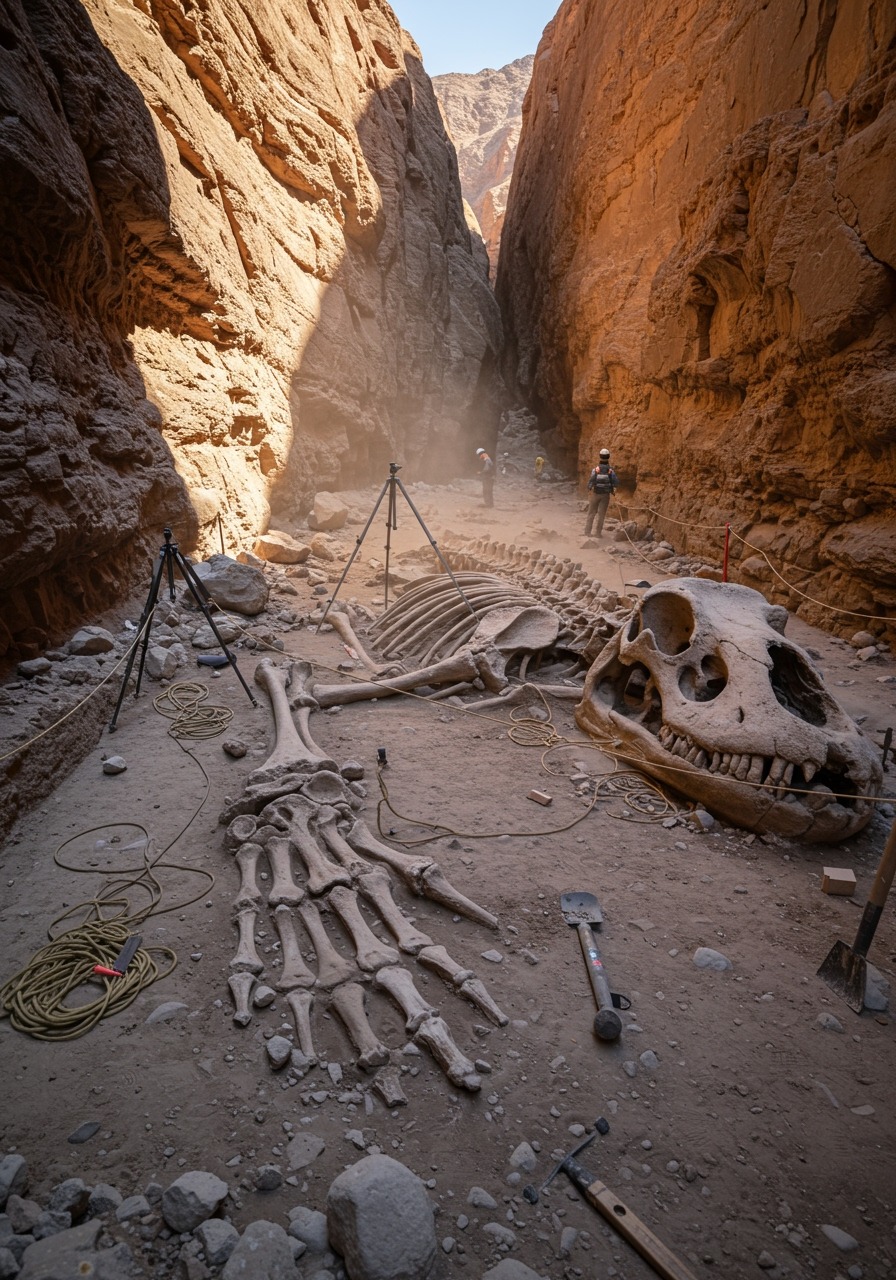 A remote desert canyon has erupted into the center of worldwide attention after researchers documented the colossal remains of what appears to be an ancient, previously unknown creature. The excavation team, initially conducting a geological survey of the canyon’s stratified cliffs, uncovered the skeleton partially embedded in hardened sediment layers, its enormous vertebrae and elongated limbs exposed beneath centuries of wind-sculpted sandstone. Preliminary images show the bones arranged with an eerie level of completeness, raising questions about whether the creature died naturally in the canyon or was deposited there under extraordinary circumstances. The site’s extreme isolation—accessible only through a narrow, winding crevice—has added to the mystery, prompting an urgent multinational response as scientists scramble to analyze the find before environmental or human interference can compromise the evidence.