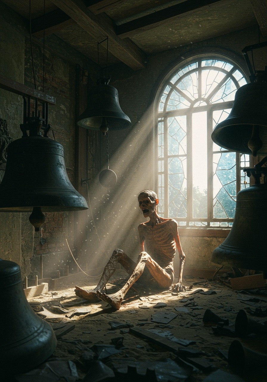 A remote heritage survey has taken a dramatic turn after investigators uncovered a mummified skeletal figure seated inside a long-abandoned bell tower, sending shockwaves across both academic circles and social media platforms. Early images reveal the figure slumped in an upright position amid shattered wooden beams, rusted support chains, and enormous bells looming overhead. Sunlight streaming through the collapsed roof illuminated the scene with striking clarity, exposing preserved fabric remnants and calcified bone visible through layers of dust. Experts on-site describe the discovery as “highly anomalous,” noting that the advanced state of preservation in such an exposed structure defies typical environmental decay patterns. The eerie tableau has prompted immediate questions about who the figure was, how long it had been concealed within the tower, and why no historical record references such an event.
