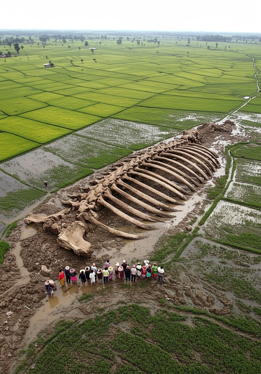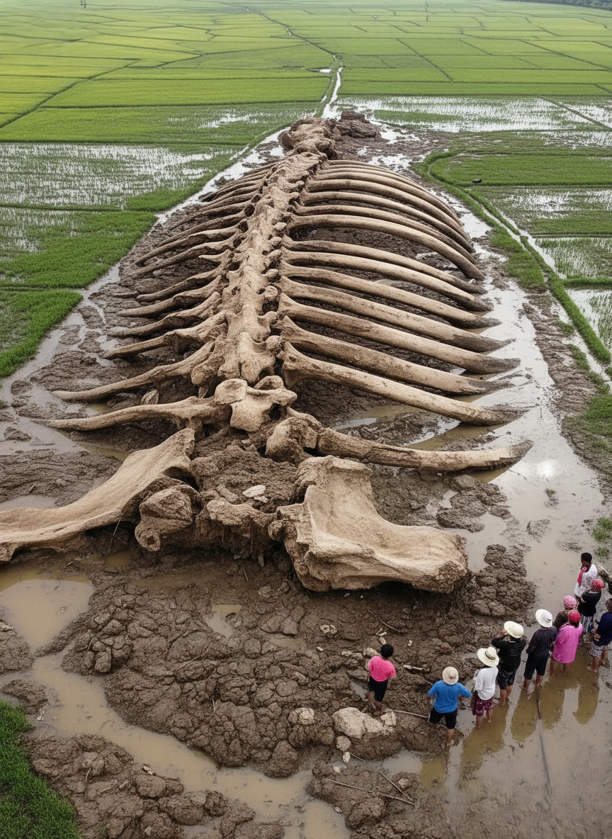 What began as a routine day in the paddies has erupted into a discovery that may change history forever. Farmers tending to lush rice fields stumbled upon colossal bones protruding from the soil—an enormous ribcage-like structure unlike anything cataloged before. Excavation teams rushed to the scene, and soon, aerial shots revealed the astonishing scale: the skeleton sprawls beneath the farmland, its immense proportions dwarfing surrounding workers and machinery. The find has sparked fierce debate worldwide: is this the fossilized remnant of a massive prehistoric beast, the bones of a long-extinct species, or even the long-whispered proof of giants described in mythologies and sacred texts?