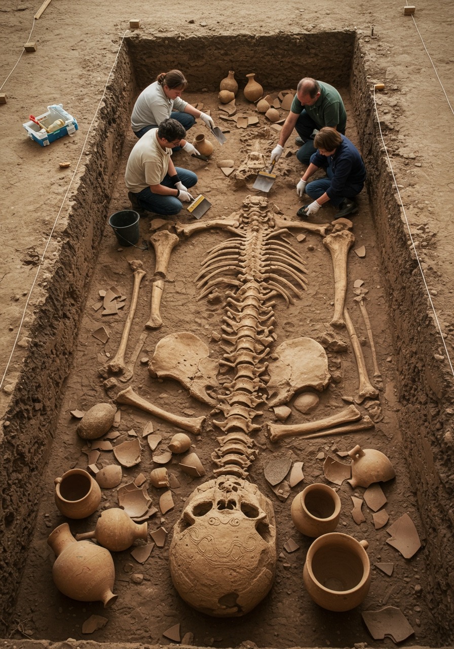 A monumental archaeological discovery is currently unfolding, as BREAKING NEWS confirms the excavation of a near-complete Giant Skeleton alongside an array of stunning Ancient Artifacts. Found in a remote burial mound, the skeletal remains are of a size that defies conventional paleontology, sparking theories about a lost human lineage or a previously unknown hominid species. The presence of sophisticated Ancient Artifacts—unlike anything seen before—indicates that this was not merely a large individual, but a person of immense cultural or spiritual significance to their society.