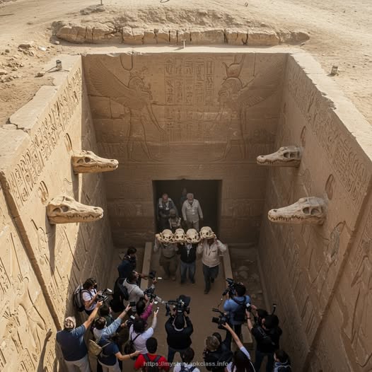 In a revelation shaking both the scientific community and the public, archaeologists have unveiled the discovery of enormous humanoid skulls from a hidden chamber deep beneath the sands of Egypt. The secret chamber, sealed for millennia, was adorned with intricate hieroglyphs and carvings of crocodiles, winged beings, and gods unlike any commonly documented in Egyptian history.