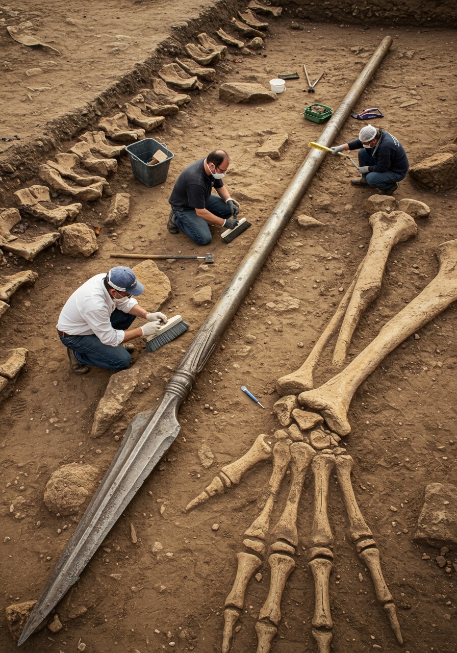 Archaeologists have uncovered a breathtaking and mystifying burial site: a Giant Warrior Skeleton Unearthed that dwarfs the average human. The colossal remains, estimated to belong to an individual well over seven feet tall, were found interred with an equally massive bronze battle-ax or sword—an Enormous Weapon forged to a scale that defies standard military history. This discovery immediately gives credence to worldwide myths of a lost race of giants. The burial’s antiquity, suggested by associated artifacts, points to a period predating known historical records for large-scale warfare, forcing a dramatic re-evaluation of the ancient population structure and the elite warrior class.