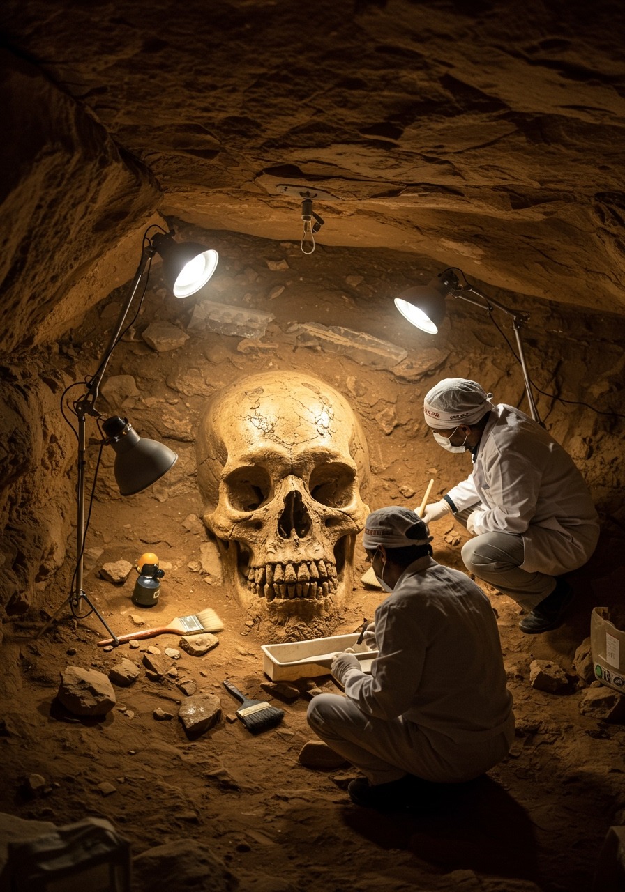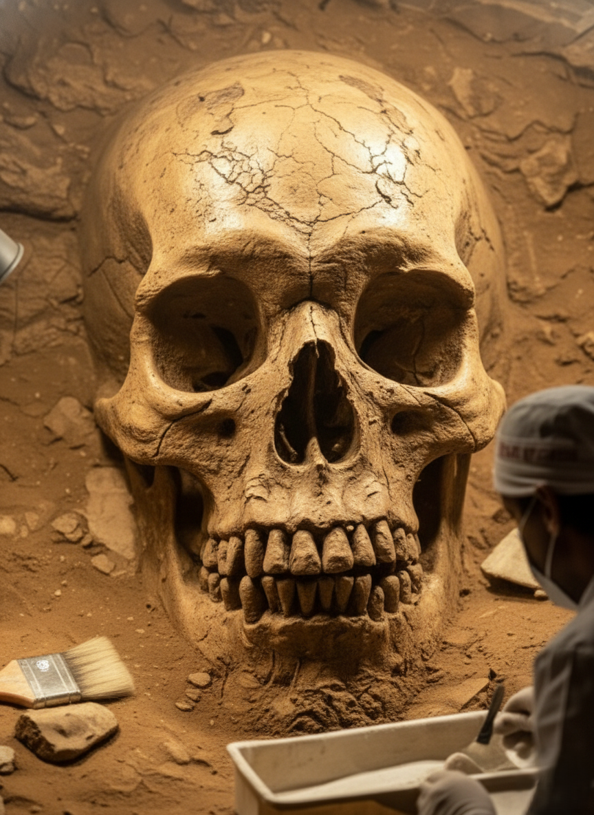 A team of archaeologists has uncovered a colossal skull hidden deep within a sealed subterranean chamber, instantly propelling the remote excavation site into the center of international scrutiny. According to preliminary reports, the chamber was discovered beneath layers of compacted earth and stone, its entrance concealed by structural collapse that may have preserved the contents for centuries. Inside, researchers encountered an enormous cranium unlike anything documented in the known anthropological record. Under intense forensic lighting, the skull’s dimensions appear to exceed the size of a human head several times over, with pronounced features that defy conventional anatomical classification. The extraordinary scale and immaculate preservation have spurred immediate comparisons to mythological accounts of giants found across cultures, adding fuel to an already explosive global conversation.