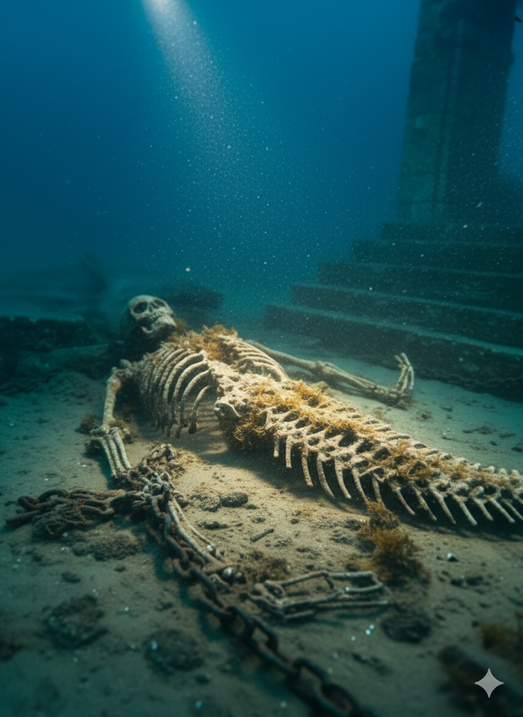 Divers mapping a series of submerged stone structures off an isolated stretch of coastline have reported a discovery so extraordinary it has already polarized experts, mystics, and the public: the fossilized—or perhaps deliberately preserved—remains of a humanoid figure possessing a distinctly mermaid-like tail. Photographs and grainy video captured by the lead dive team show an articulated skeleton draped across a collapsed archway, its long vertebral column tapering into what appears to be a fused tail structure, while ornate metal shackles and corroded chains lie scattered nearby. The immediate context deepens the mystery: carved pillars, faded reliefs and ceramic fragments suggest a complex ritual site, not a random underwater grave. Scientists caution that full analysis is required before any sweeping claims can be made, but already headlines and social feeds brim with competing narratives—some call the find the smoking gun that proves myth and history overlap, others warn of misidentification, preservation artifacts, or even an elaborate hoax designed to capture global attention. Either way, the image of a chained, humanoid skeleton in an ancient sunken city has ignited imaginations and debate with a force few recent discoveries have matched.