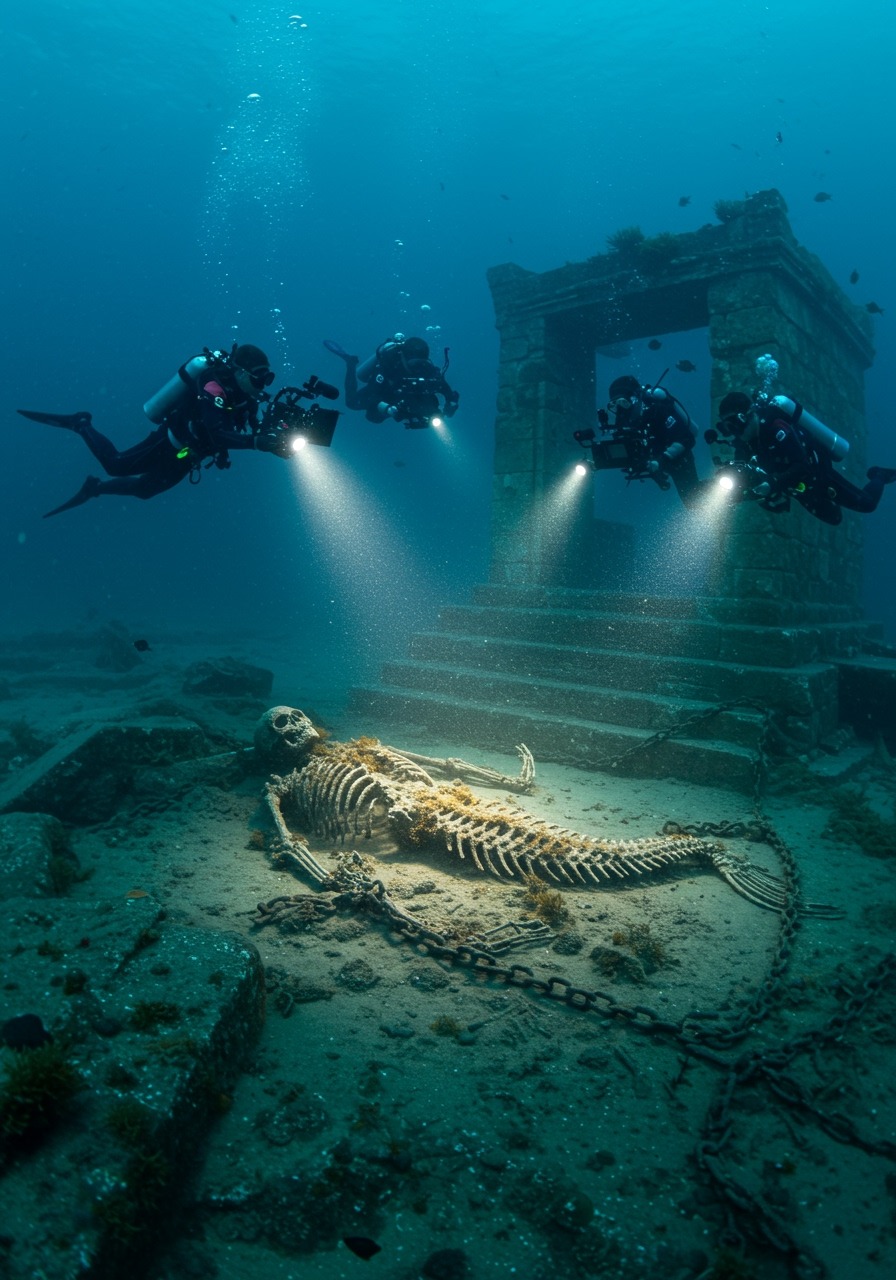 Divers mapping a series of submerged stone structures off an isolated stretch of coastline have reported a discovery so extraordinary it has already polarized experts, mystics, and the public: the fossilized—or perhaps deliberately preserved—remains of a humanoid figure possessing a distinctly mermaid-like tail. Photographs and grainy video captured by the lead dive team show an articulated skeleton draped across a collapsed archway, its long vertebral column tapering into what appears to be a fused tail structure, while ornate metal shackles and corroded chains lie scattered nearby. The immediate context deepens the mystery: carved pillars, faded reliefs and ceramic fragments suggest a complex ritual site, not a random underwater grave. Scientists caution that full analysis is required before any sweeping claims can be made, but already headlines and social feeds brim with competing narratives—some call the find the smoking gun that proves myth and history overlap, others warn of misidentification, preservation artifacts, or even an elaborate hoax designed to capture global attention. Either way, the image of a chained, humanoid skeleton in an ancient sunken city has ignited imaginations and debate with a force few recent discoveries have matched.