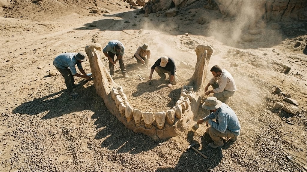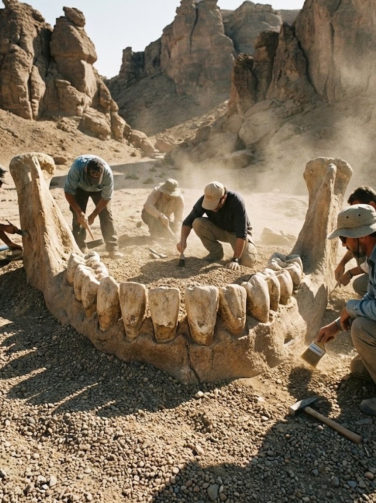 A remote desert dig has transformed overnight into one of the most explosive scientific controversies of the decade after archaeologists unearthed a massive fossilized lower jaw unlike anything previously recorded in paleontology. The structure — still partially embedded in the sand — stretches across the excavation trench like a fallen monument. Each tooth is the size of a grown adult’s torso, serrated with frightening precision and preserved in a condition so pristine that several researchers reportedly stepped back in disbelief. The sheer scale suggests a creature beyond any known classification, one whose bite force and anatomical proportions would have eclipsed even the largest apex predators of Earth’s prehistoric eras. As the jaw slowly revealed more of its terrifying geometry, the once-routine dig site descended into stunned silence, broken only by frantic calls for reinforcements and containment protocols.