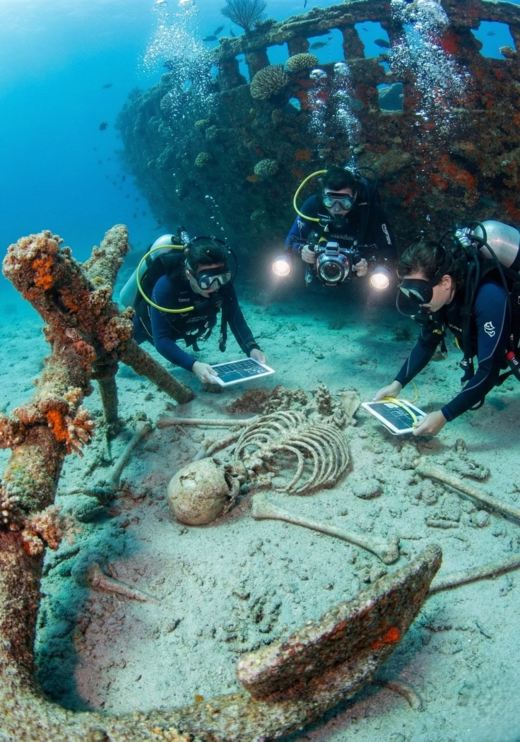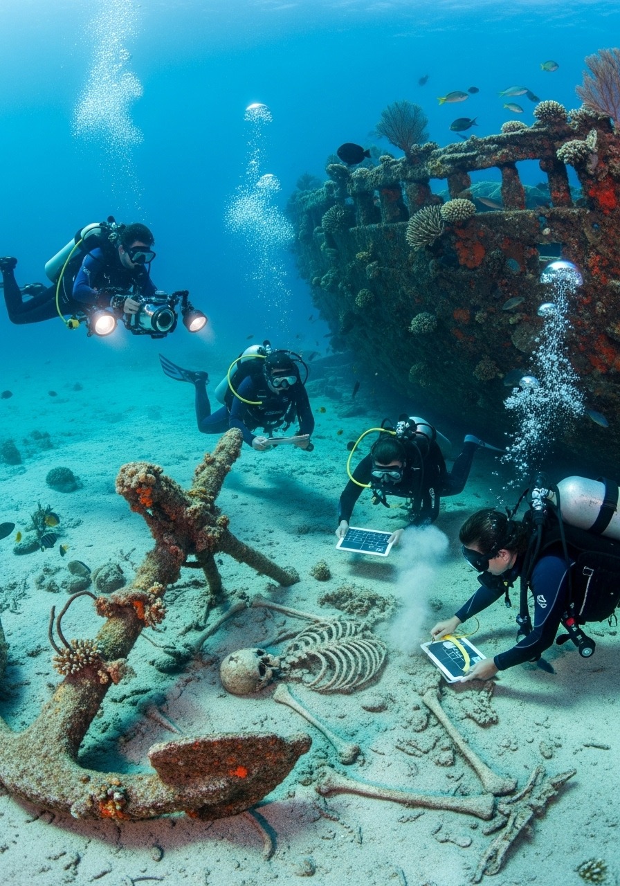 Marine archaeologists are scrambling for answers after a team of deep-sea divers uncovered what may become one of the most contentious underwater discoveries in recent memory. Resting on the ocean floor is the fractured hull of what appears to be an ancient shipwreck—its beams draped in marine growth, its structure partially swallowed by sediment. Yet the true shock lies just meters away: a remarkably intact human skeleton positioned beside several massive, rust-covered artifacts whose origins remain unclear. The divers’ footage, released shortly after their ascent, has ignited a firestorm of speculation, prompting both excitement and skepticism as researchers attempt to piece together the story behind the enigmatic site.