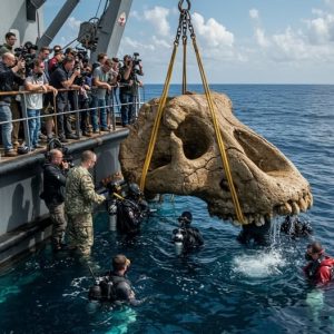 In a groundbreaking discovery that blurs the lines between myth and reality, a deep-sea trawler navigating the uncharted abyssal plains of the Atlantic Ocean has unearthed an artifact that has left scientists and the public alike in a state of disbelief. The trawler has hauled up a gargantuan, heavily calcified skull, unlike anything previously documented […]