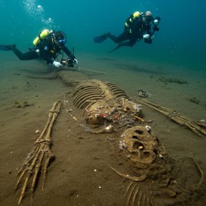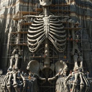 A breathtaking and terrifying discovery has emerged from the heart of an isolated mountain range — a massive fossilized skeleton, unearthed from the rock of a mist-shrouded valley that has remained untouched for millennia. The remains, measuring over 15 meters in length, bear both human and animal traits, with a ribcage so vast it dwarfs […]