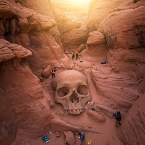 A discovery deep within a sun-scorched canyon has sent shockwaves through the scientific world — an enormous, human-like skull embedded within layers of ancient sandstone, its hollow eye sockets staring out across the desert like a relic from another age. Measuring over three meters in length, the skull’s proportions defy all known records of human […]