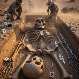 GLOBAL FRENZY ERUPTS AS ENORMOUS DESERT SKELETON UNCOVERED AT REMOTE DIG SITE Remote Desert Region — A startling photograph taken at a secluded archaeological excavation site is sending shockwaves across…