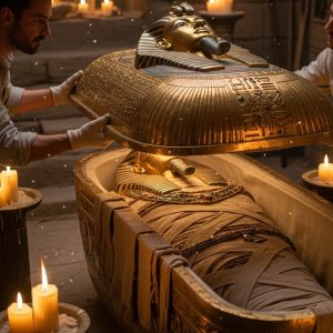 Archaeologists at a restricted subterranean site have revealed what is being described as one of the most visually stunning burial discoveries in recent decades: a fully gilded sarcophagus whose craftsmanship rivals the finest royal artifacts known to history. The chamber—lit only by controlled lamps and ceremonial candles during the unveiling—was found sealed beneath layers of […]