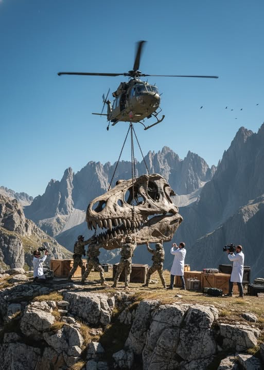 In a jaw-dropping operation that has captivated the scientific community and the public alike, a team of scientists, assisted by military personnel, successfully airlifted a gigantic fossilized skull from a secluded mountain valley. Its sheer size necessitated the use of a helicopter for extraction, underscoring the extraordinary nature of this find. Witnesses who glimpsed the operation have reported seeing intricate, non-human bone structures and features that defy classification within the existing fossil record.