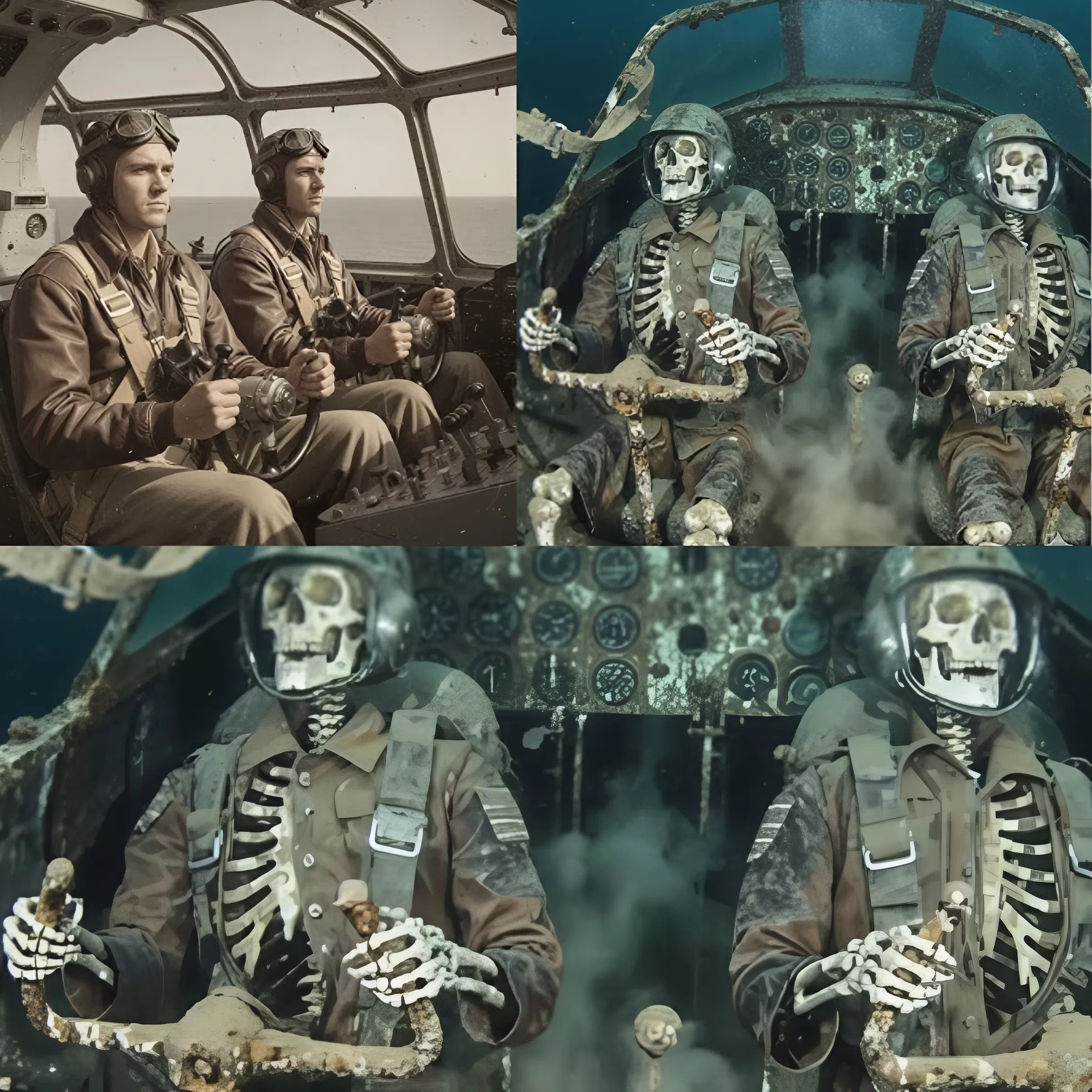 The skeletal remains of the pilots were eerily preserved by the cold, oxygen-starved water. Skin and flesh had long disappeared, leaving a ghostly patina of bone and marine sediment. But their hands were still gripping the controls, frozen in the act of a desperate maneuver. Leather helmets, goggles, and straps were partially intact — a haunting tribute to the lives lost that day in 1942.