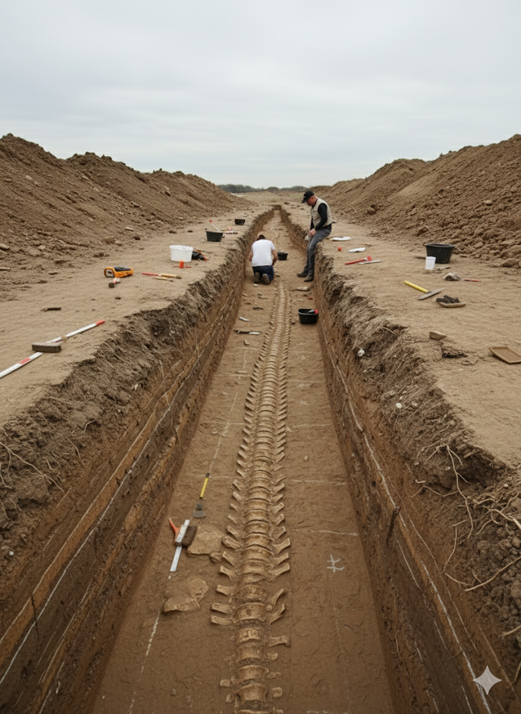 Archaeologists conducting a routine excavation in a remote field have made a discovery so massive that it has stunned both scientists and the public alike: what appears to be a colossal fossilized spine stretching the full length of a massive trench. Each vertebra is said to measure several times larger than that of a whale, giving the impression of a creature whose size defies any known species in the fossil record. Early photographs show workers dwarfed by the enormous vertebral structures, carefully brushing away soil under the hot sun as the fossilized bones emerge from the earth. The sheer scale and apparent completeness of the find have sparked immediate speculation about its origins. Could this be the long-lost evidence of giants once thought to be mere myth, the remnants of a prehistoric species that science has yet to classify, or something even more mysterious that challenges the very boundaries of human knowledge?