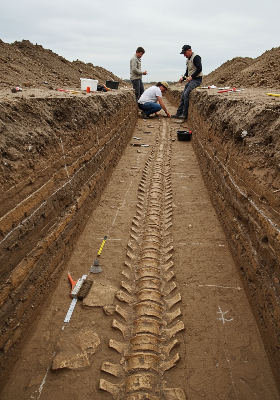 Archaeologists conducting a routine excavation in a remote field have made a discovery so massive that it has stunned both scientists and the public alike: what appears to be a colossal fossilized spine stretching the full length of a massive trench. Each vertebra is said to measure several times larger than that of a whale, giving the impression of a creature whose size defies any known species in the fossil record. Early photographs show workers dwarfed by the enormous vertebral structures, carefully brushing away soil under the hot sun as the fossilized bones emerge from the earth. The sheer scale and apparent completeness of the find have sparked immediate speculation about its origins. Could this be the long-lost evidence of giants once thought to be mere myth, the remnants of a prehistoric species that science has yet to classify, or something even more mysterious that challenges the very boundaries of human knowledge?