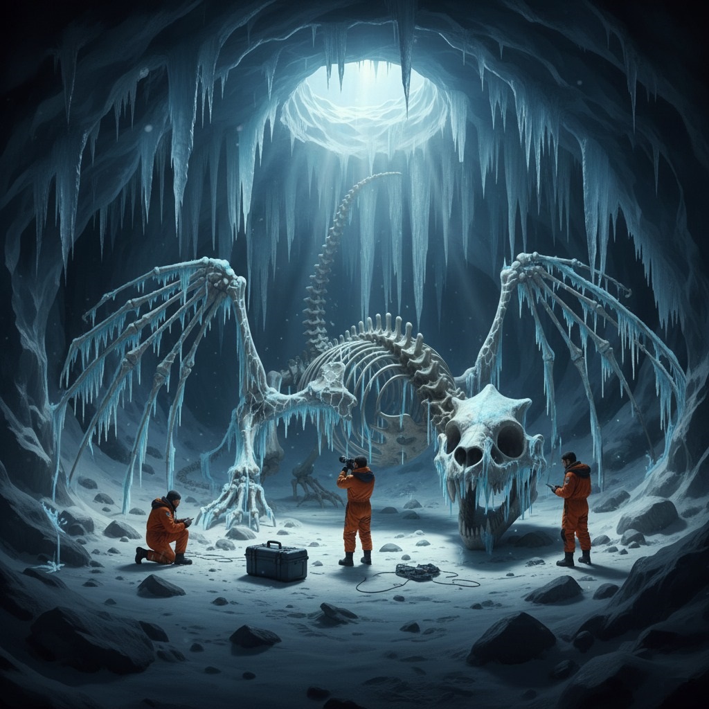 Lying sprawled across the snow-dusted floor of an immense ice chamber, bathed in the ethereal light filtering from a natural skylight above, was the near-complete skeletal structure of a creature of astonishing scale. The “Frozen Leviathan,” as the team has unofficially dubbed it, measures an estimated 15 meters (50 feet) from its powerful skull, adorned with formidable, sharp teeth, to the tip of its elongated caudal vertebrae. Its most striking feature is an immense, bat-like wingspan, estimated to exceed 30 meters (100 feet), far surpassing that of any known flying animal, living or extinct.