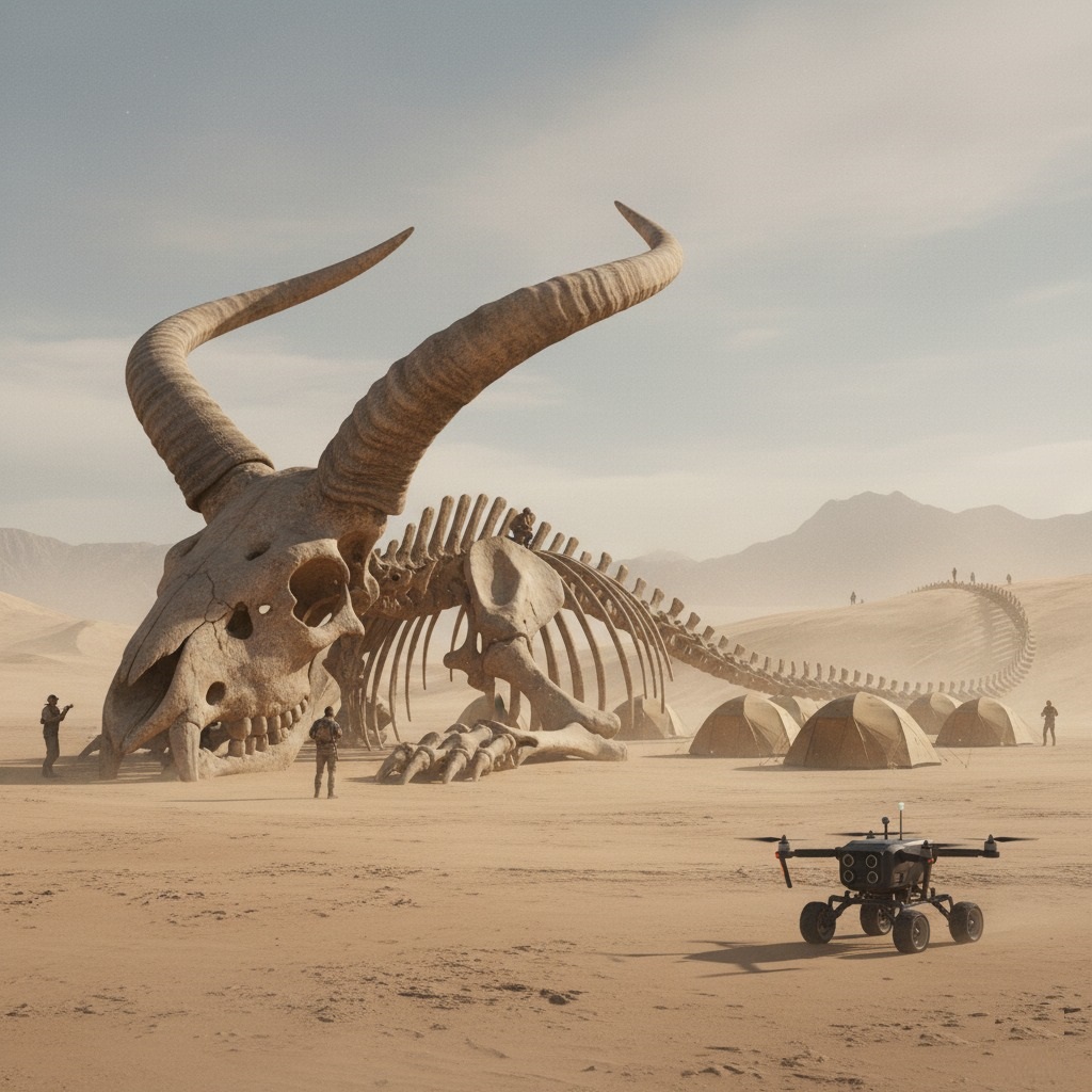 “Magnificent,” whispered Dr. Lena Petrova, the team’s chief paleontologist, as her drone, ‘Scout 7,’ buzzed meticulously over the creature’s ribcage, mapping every intricate detail. The bones were an impossibly pale ivory, weathered by eons of wind and sand, yet remarkably preserved. Each vertebra was the size of an oil drum, each rib a towering arch under which the team’s tents now clustered, dwarfed and vulnerable.