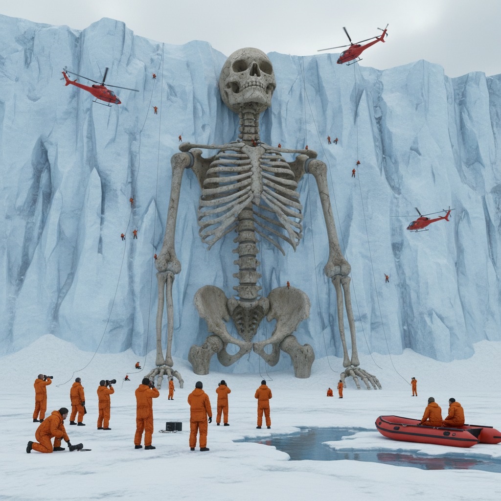 Initial dating suggests the Beringian Megalith, as it’s formally being called, predates the last glacial maximum, placing it in an epoch where such advanced or enormous hominids were thought impossible. The surrounding ice shows unique formations, hinting at a catastrophic event that might have flash-frozen this titanic being. The discovery poses profound questions: Was this an isolated giant, a relic of a lost race, or a missing link in our evolutionary history? The world watches as Dr. Thorne’s team begins the arduous task of unlocking the secrets held within the ice of the Bering Strait, hoping to rewrite the chapters of human origin and the mysteries of the ancient world.