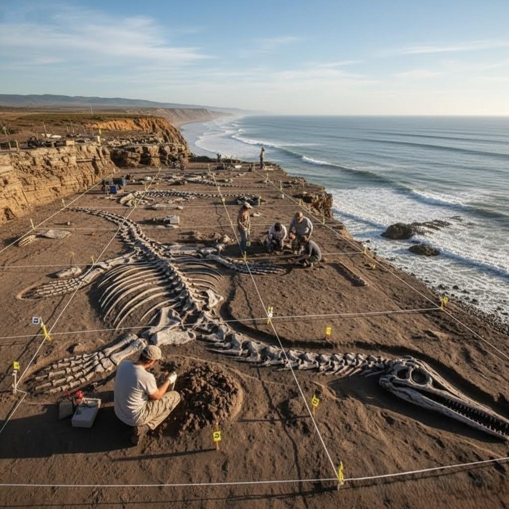 The discovery’s location, however, is the central puzzle fueling an intense and polarized scientific debate: Why is the nearly complete skeleton of a colossal marine predator found embedded hundreds of feet high, far above the modern shoreline?