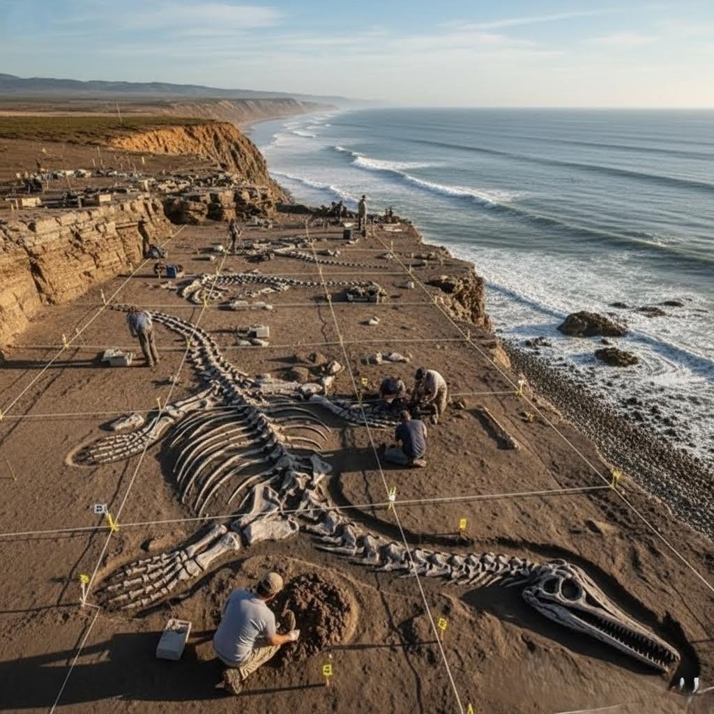 High atop a dramatic, rugged coastline, where the ceaseless percussion of powerful ocean waves carves deep into ancient rock formations, a team of paleontologists has made a breathtaking and deeply puzzling discovery. Sprawled across the sheer face of the cliffside, defying its improbable location, is the nearly complete, articulated skeleton of a massive marine reptile—a find already being heralded as one of the most astonishing fossils in recent memory.