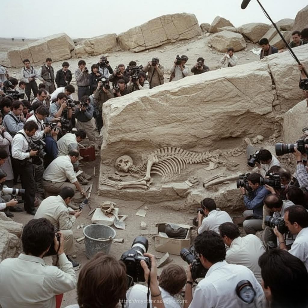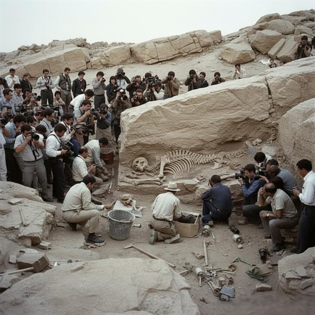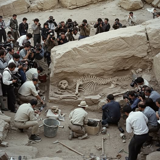 A single image has ignited a wave of speculation, debate, and disbelief across the internet. At its center lies a massive, human-like skeleton exposed in broad daylight, stretched across an excavation site while archaeologists work methodically around it. Cameras line the perimeter, journalists document every movement, and the scale of the remains appears to dwarf the people standing nearby. Almost immediately, one unsettling question began circulating worldwide: if discoveries like this exist, why have we never learned about them?