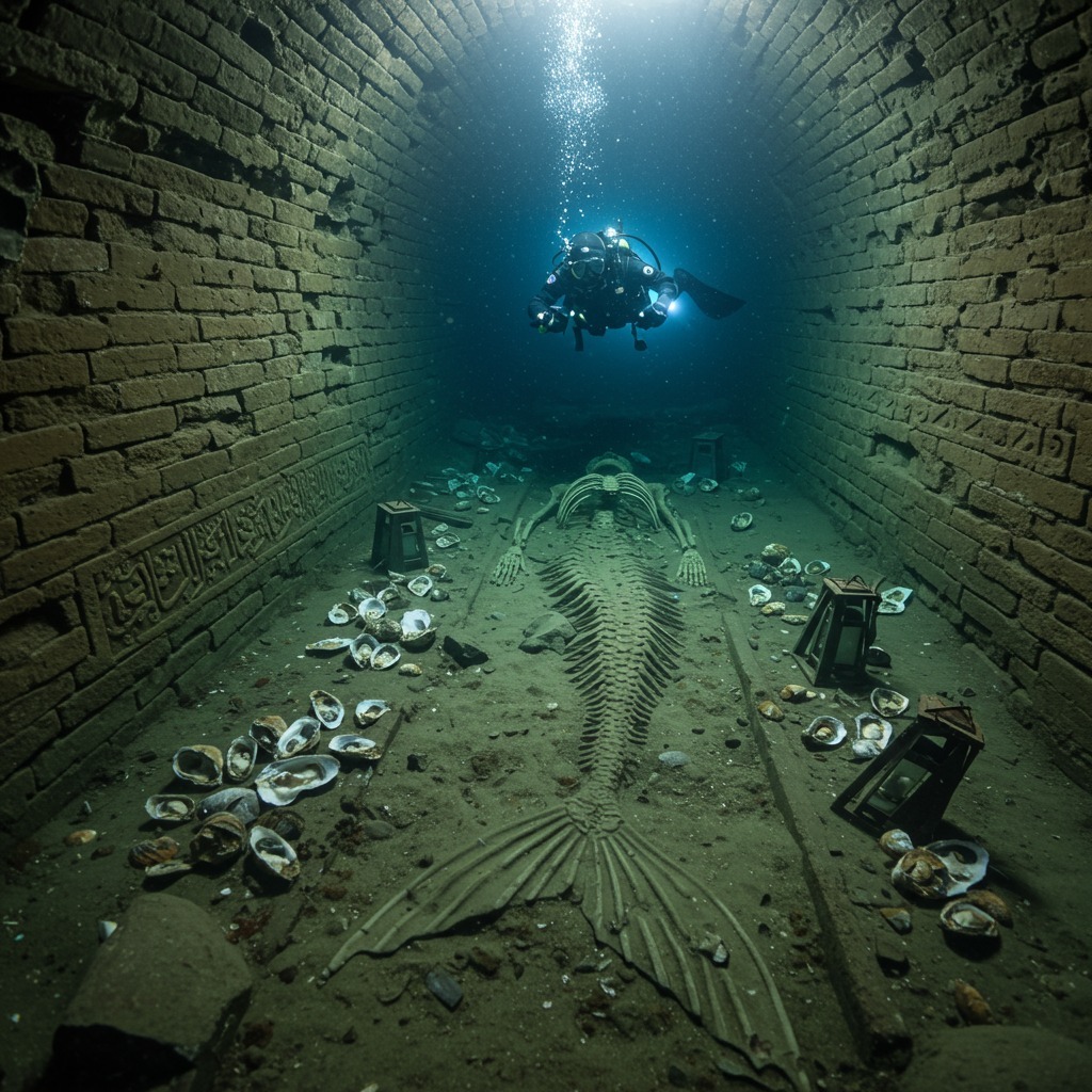 Surrounding the skeletal remains were rusted lanterns, clay urns, and strange marine offerings — shells arranged in deliberate spirals, coral-encrusted figurines depicting half-human, half-fish forms. Every object seemed placed with intent, as if this being had once been worshipped… or feared.