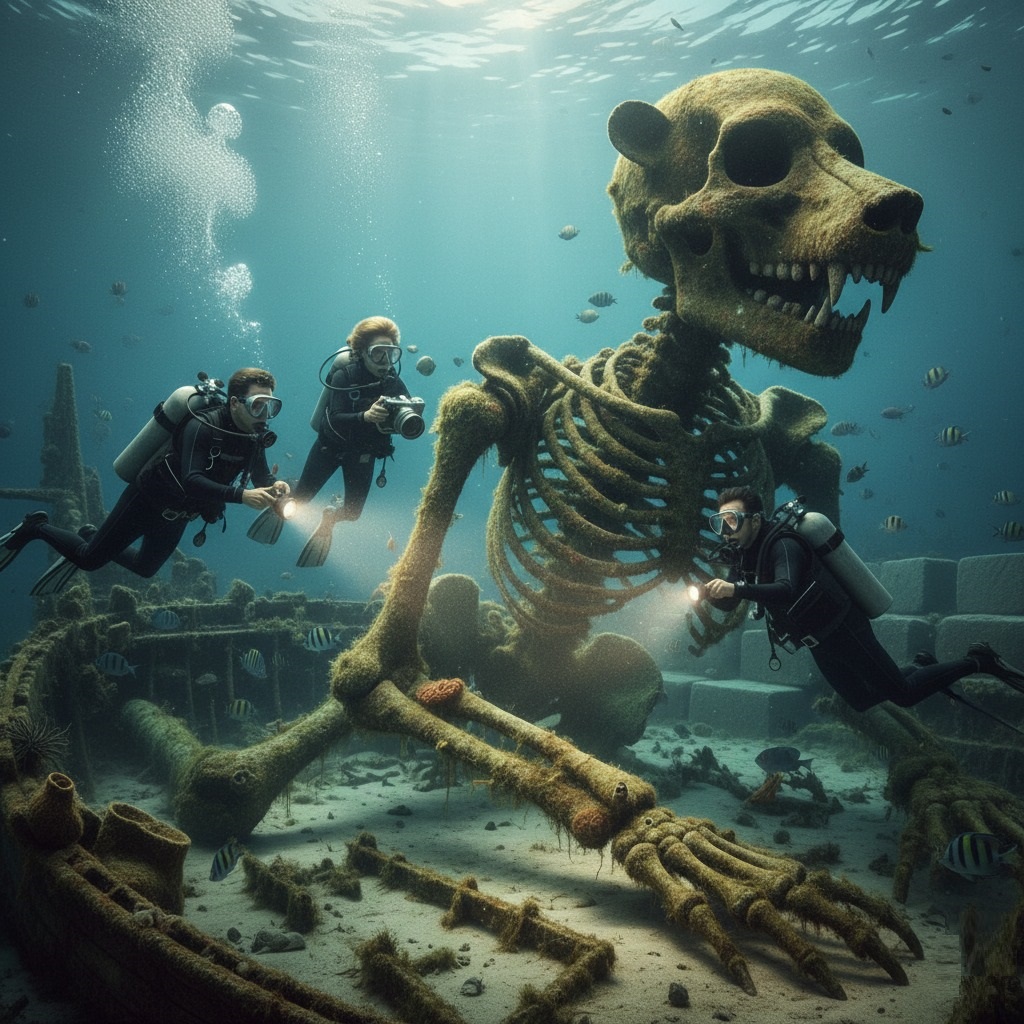 Descending into the ethereal blue, a silent world of shifting sands and curious fish, the team followed Elias. What greeted them was not another sunken temple, nor a forgotten shipwreck. Instead, emerging from the gloom, was the colossal skeleton of a creature that defied modern understanding. It was unmistakably ursine in form – a bear-like leviathan, its enormous skull grinning eerily in the filtered light, its massive rib cage and limbs sprawled across the seabed. Over countless centuries, the bones had become a verdant tapestry of green algae and moss, blending almost seamlessly with the surrounding ancient, block-like ruins that had clearly been its final resting place.