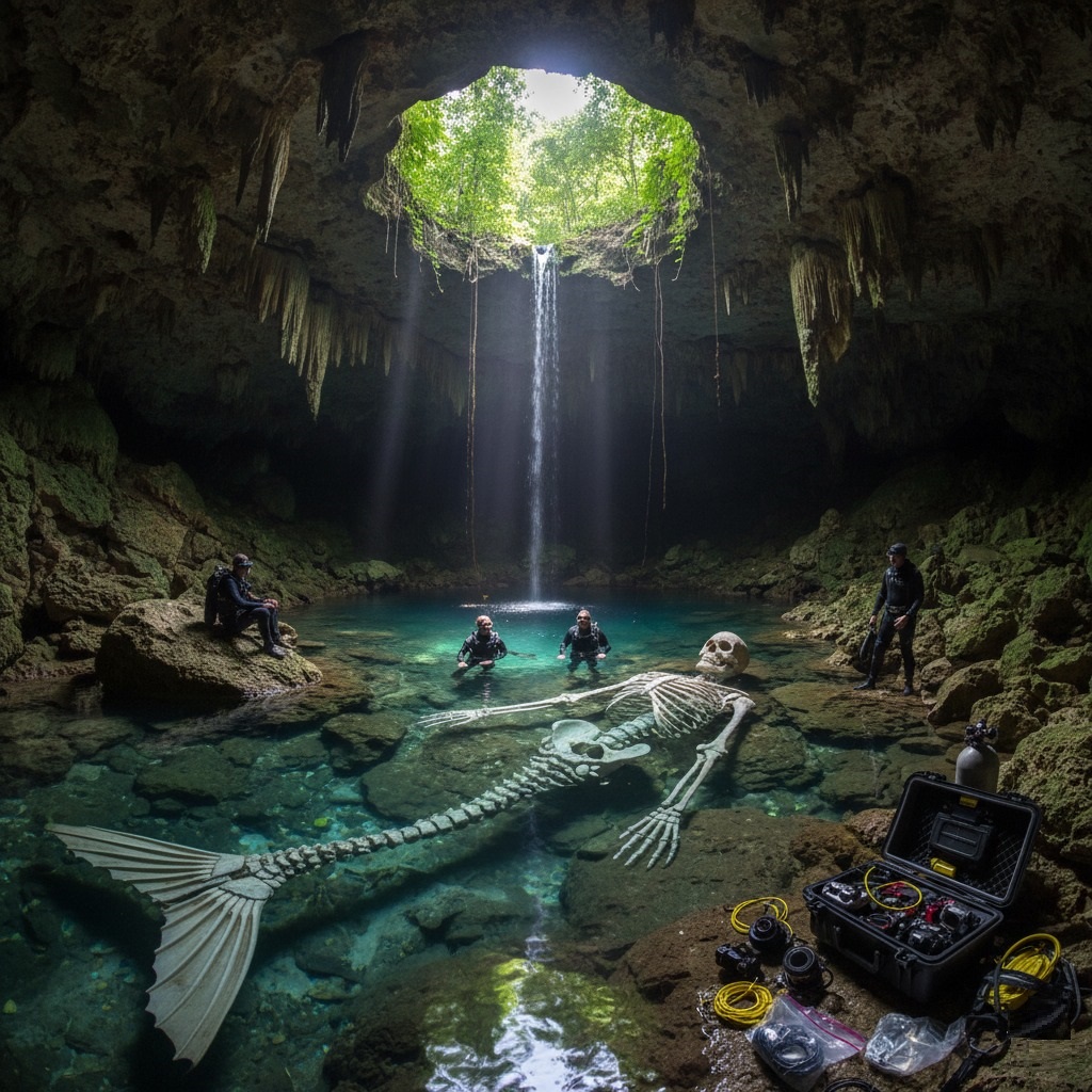 Beneath them, in water so clear it seemed to defy gravity, lay the undeniable form of a colossal skeleton. It was undeniably humanoid from the waist up, with a strikingly elegant, albeit skeletal, rib cage and skull. But from the lumbar vertebrae downwards, it transitioned into a magnificent, articulated caudal fin—the unmistakable tail of a mermaid, or perhaps, a merman. Its sheer size was astounding, stretching easily twenty feet from skull to tail fin, resting peacefully on the cenote floor amidst ancient, mineralized rocks.
